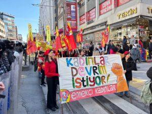 Unter diesen Umständen war der 8. März von kraftvollen Demonstrationen in vielen Städten der Türkei geprägt, insbesondere in Großstädten wie Istanbul, Ankara, Izmir, Eskişehir und Amed. In Istanbul organisierte die von uns als „8. März-Frauenplattform“ geleistete Arbeit eine starke Aktion: Nach einem großen Marsch, an dem Tausende von Frauen teilnahmen, versammelten wir uns zur „Großen Frauenversammlung“. Tausende Frauen kamen unter dem Motto zusammen: „Frauen revoltieren gegen Armut, Gewalt, Ausbeutung und Krieg!“